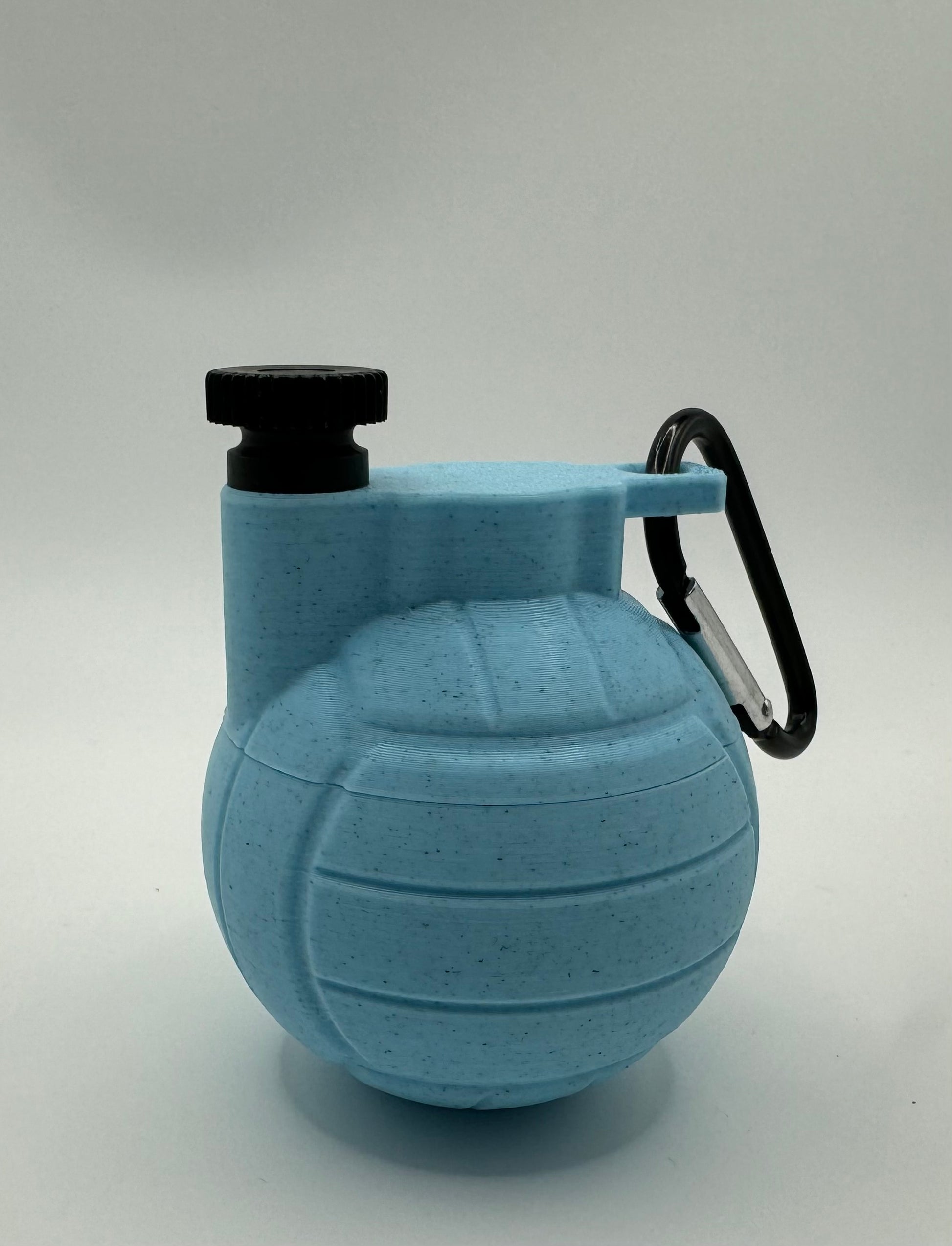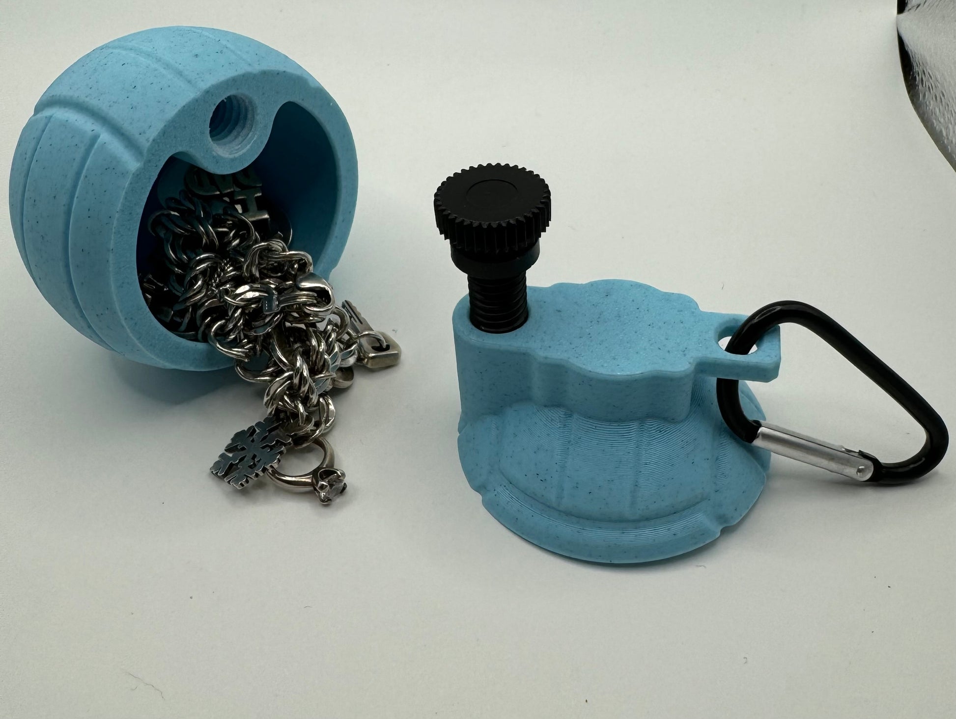 The Volley-Bomb was designed in two parts, allowing it to accommodate even large jewelry pieces like charm bracelets. These components are expertly connected using a screw mechanism, ensuring secure and seamless assembly. Its versatile design allows it to be easily attached to various items such as backpacks, water containers, or purses, enhancing both style and functionality for athletes on the go. Each Volley-Bomb comes complete with its own carabiner, adding a touch of convenience. (Does not include jewelry)
